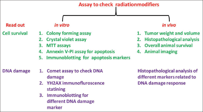 | Figure 3: Different assays to screen radiosensitizer and radioprotector. Various in vitro and in vivo assays could be adapted to evaluate the effects of potential radiation-modifiers. [Click here to view] |
