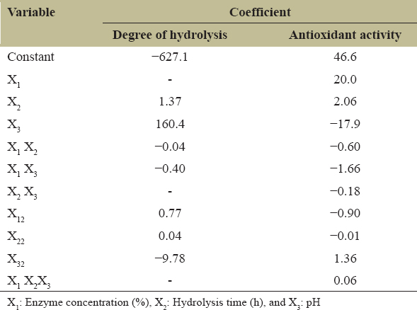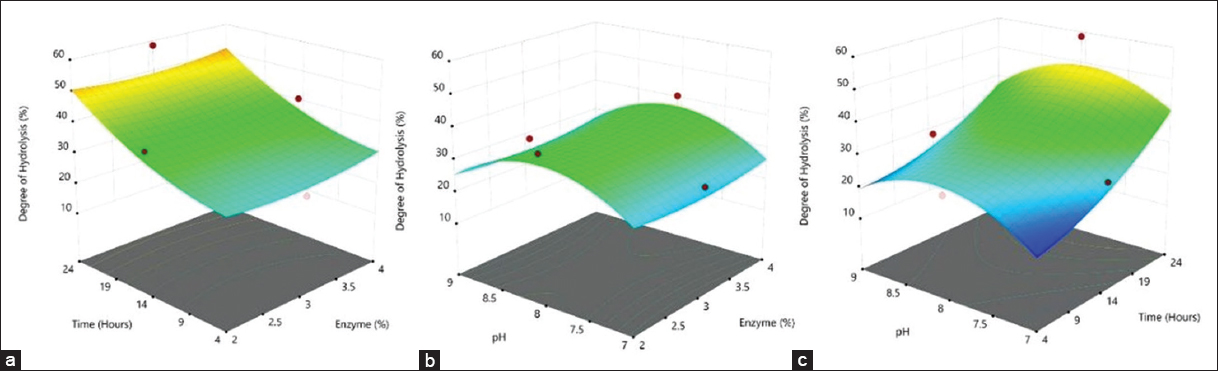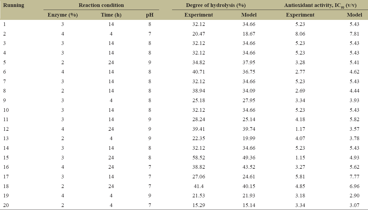 The results of the degree of hydrolysis are revealed in Table 3, while the coefficients of the regression model equation are presented in Table 4. The highest degree of hydrolysis (58.52%) was obtained at 3% concentration of enzyme, an incubation time of 24 h, and pH 8. The degree of hydrolysis obtained in this study is slightly higher than the degree of hydrolysis (47.4%) reported by Firmansyah and Abduh [5]. The differences in the degree of hydrolysis may be contributed by the pre-treatment step introduced in this study where the protein was first extracted with alkaline (NaOH) at an elevated temperature (50°C) to facilitate the hydrolysis of the extracted protein solution.