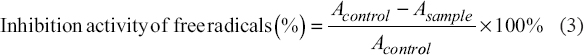 The antioxidant activity of the protein hydrolysate was analyzed from the scavenging ability of DPPH as indicated by the concentration of IC50. The solution was mixed with aquades to a concentration of 0.25–1.25%. After adding the DPPH solution, the solution was incubated in a dark room for 30 min. The absorbance (A) of the solution was then quantified using a spectrophotometer at a wavelength of 517 nm [11]. The total value of free radicals can be determined using Equation (3).