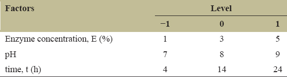 Table 1: Factors and level for the hydrolysis of extracted protein solution using a face-cantered central composite design.