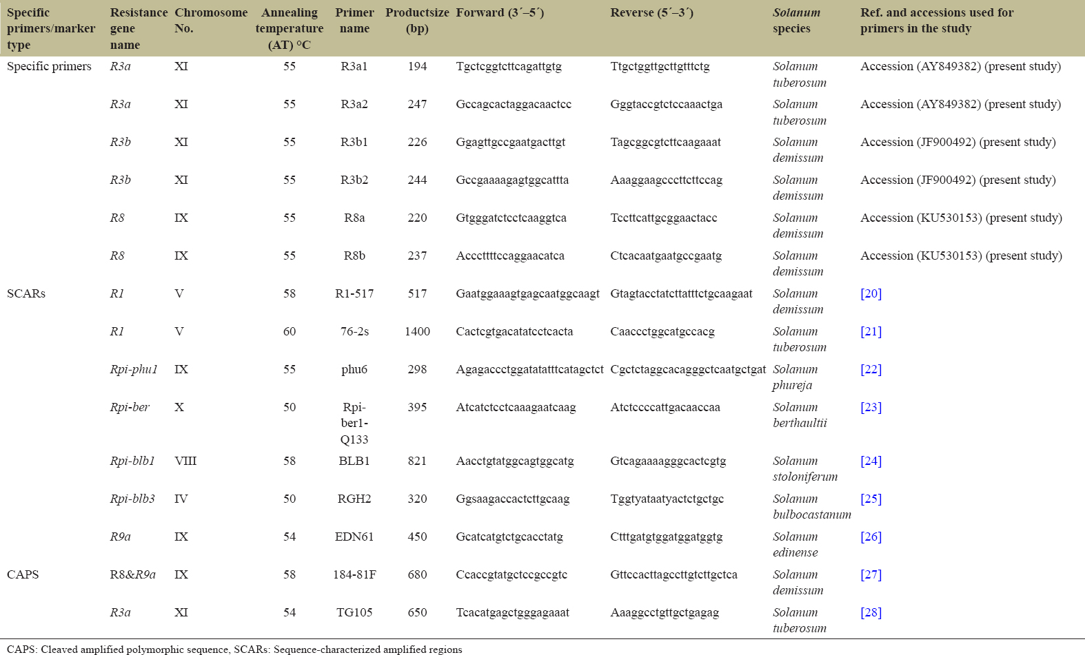 | Specific primers/marker type | Resistance gene name | Chromosome No. | Annealing temperature (AT) °C | Primer name | Productsize (bp) | Forward (3?–5?) | Reverse (5?–3?) | Solanum species | Ref. and accessions used for primers in the study |