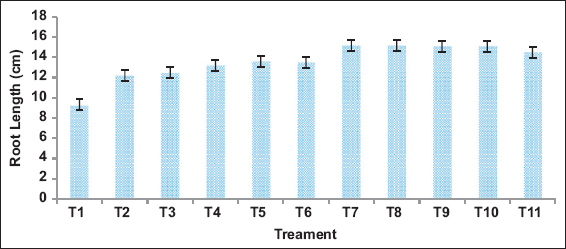 ![]() | Figure 2: Effect on GA3 treatments on root length (cm) of black gram. Treatment details: T1 – Control, T2 – 50 ppm, T3 – 100 ppm, T4 – 150 ppm, T5 – 200 ppm, T6 – 250 ppm, T7 – 300 ppm, T8 – 350 ppm, T9 – 400 ppm, T10 – 450 ppm, and T11 – 500 ppm. [Click here to view] |