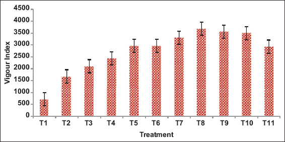 ![]() | Figure 4: Effect on GA3 treatments on vigor index of black gram. Treatment details: T1 – Control, T2 – 50 ppm, T3 -100 ppm, T4 - 150 ppm, T5 – 200 ppm, T6 – 250 ppm, T7 – 300 pp m, T8 – 350 ppm, T9 – 400 ppm, T10 – 450 ppm, and T11 – 500 ppm. [Click here to view] |