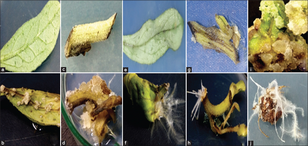 In this study, HR formation was directly influenced by different A. rhizogenes strains such as ATCC 15834, R1000, LBA 9204, MTCC 2364, and MTCC 532 infected for various time durations (0–25 min) with three explants (wild leaf, stem, and callus) of A. javanica [Figure 1e-j]. Transferred DNA (T-DNA) from the Ri (root-inducing) plasmid of the A. rhizogenes bacteria was integrated and expressed in the plant genome, resulting in HR induction [33]. Observing the hair like projections around the roots (similar to cat hairs) helped to identify the morphology of the HR formed by A. rhizogenes. As in this study, different A. rhizogenes strains were used to induce HR in C. roseus [34]. The five strains showed varying degrees of infection after 48 h of cocultivation. Similarly, Artemisia annua and Berberis aristata were also found effective in HR induction after a cocultivation time of 48 h [35,36]. It has been demonstrated that cocultivation time of less than 48 h reduces the rate of Ri plasmid transformation and over 48 h spoils the nature of the explants and affects the HR induction. Transformation frequency was strongly related to cocultivation duration and 2 days has been the most effective. In this case, tissue deterioration was observed when cocultivation lasted more than 2 days due to bacterial proliferation [37]. According to the infection period, all strains were significantly involved in generating HRs on in vitro calluses, wild shoots, and leaves.