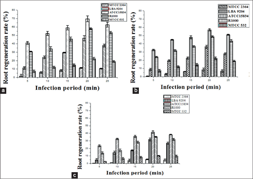 | Figure 2: Efficiency of Agrobacterium rhizogenes strains and incubation period on hairy root induction: (a) Root regeneration rate from callus explant based on infection period, (b) root regeneration rate from leaf explant based on infection period, and (c) root regeneration rate from shoot explant based on infection period. Data represented mean ± Standard Error of the three independent experiments. Mean values showed by different letters are significantly different at P < 0.05 (DMRT). [Click here to view] |