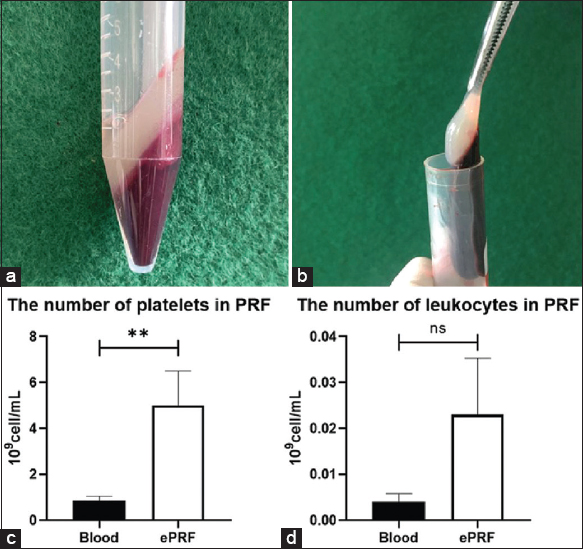 The centrifugation was used to collect the PRF [Figure 1a and b]. The platelet count in the PRF and the original sample was 5.018 ± 1.471 × 109 platelets/mL (P < 0.05) and 0.876 ± 0.164 × 109 platelets/mL, while the mean leukocyte concentration was 0.023 ± 0.012 × 109 leukocytes/mL (P > 0.05) in the PRF and 0.004 ± 0.001 × 109 leukocytes/mL in peripheral blood [Figure 1c and d]. As a consequence, in PRF, the number of platelets was 5 times higher than in normal blood (P < 0.05), but the number of leukocytes had few changes.